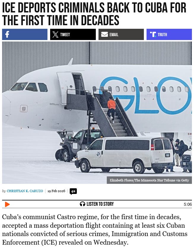 (4) Breitbart News Breaking ~ (February 19, 2026) “ICE Deports Criminals Back To Cuba” [see above image message] {breaking} Breitbart News