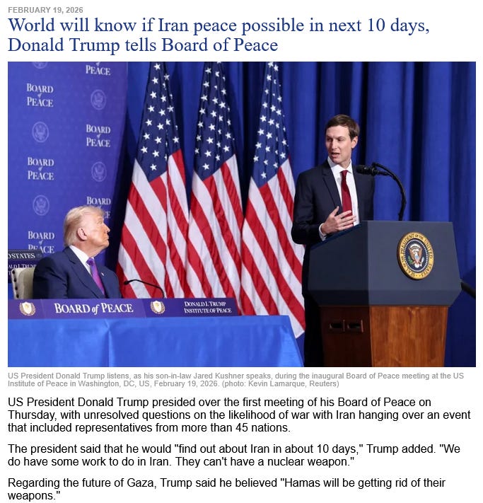 (1) Koenig International News ~ (February 19, 2026) President Trump chairs first Board Of Peace [see above image] on Gaza Situation in special meeting held in Washington DC {breaking} Koenig International News